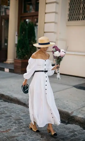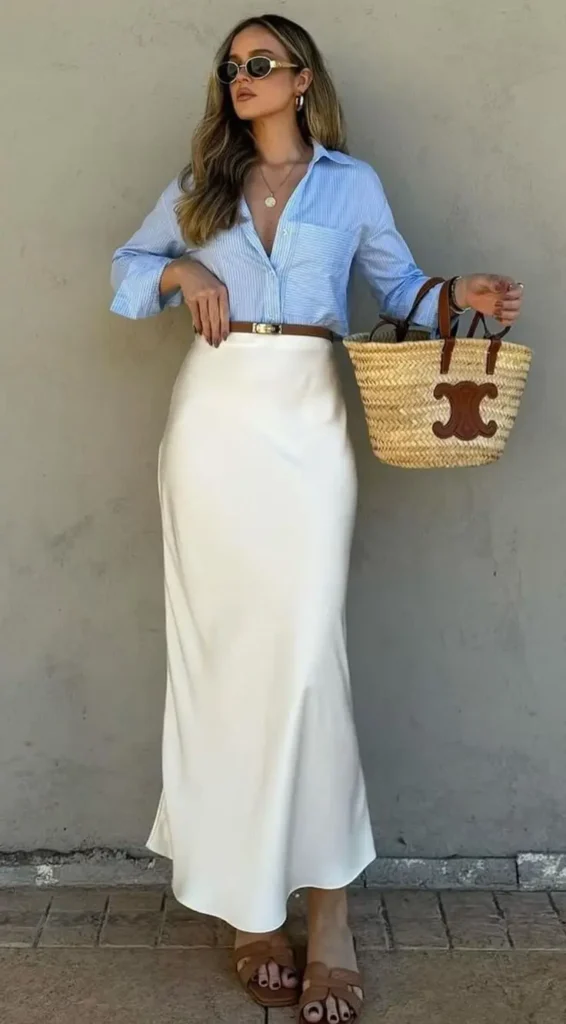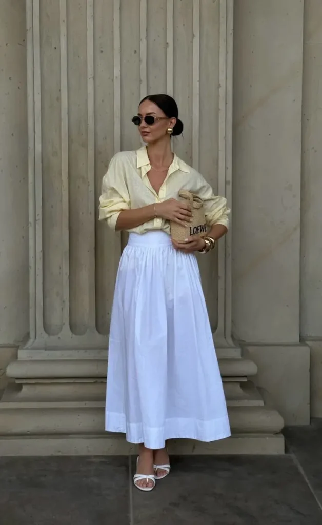 Sapatos Elegantes: Um par de scarpins ou sandálias brancas, combinado com um vestido ou saia midi, completa o visual com elegância.