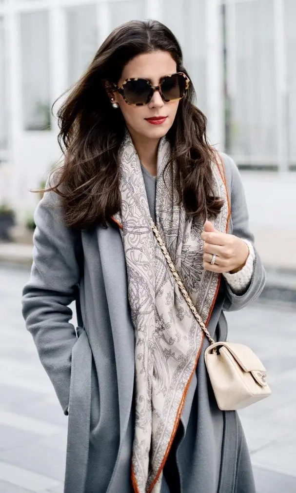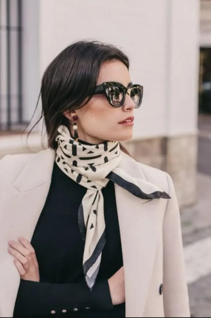 Look minimalista: Para um visual mais clean, escolha um lenço em tom neutro, amarre-o no pescoço e combine com peças simples.