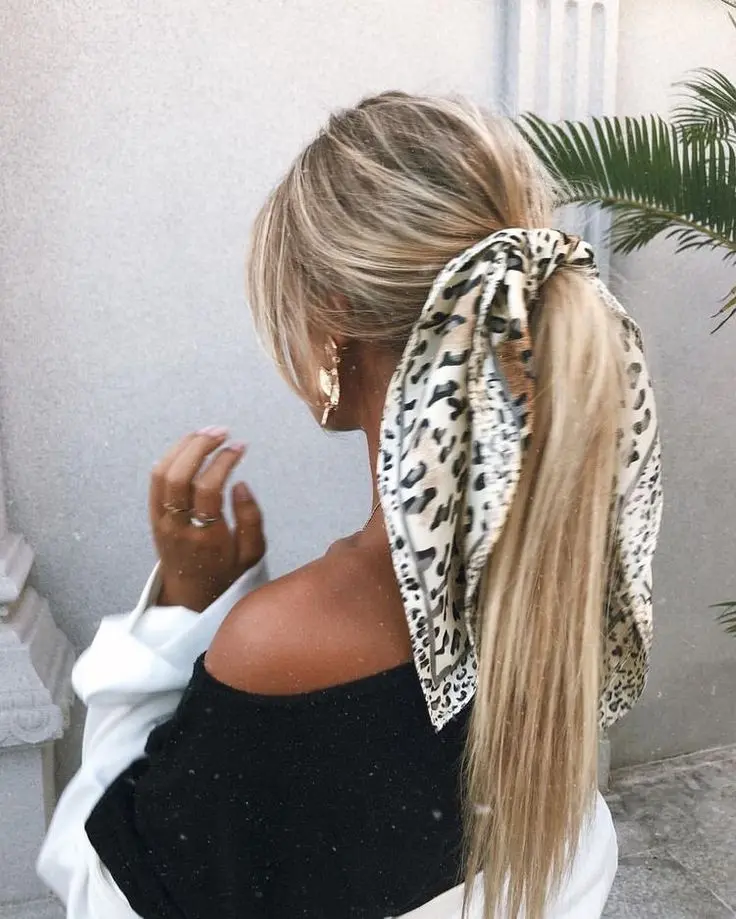 Amarre o lenço no rabo de cavalo. Instantaneamente deixa o visual mais fashion.