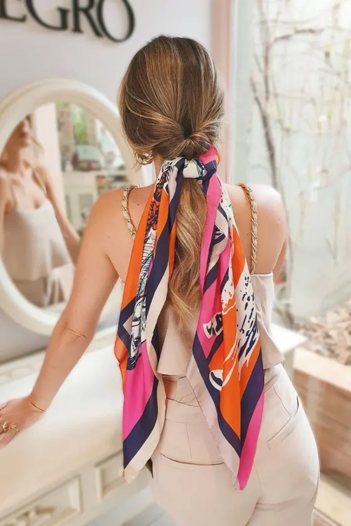 Amarre no pescoço: Um clássico que nunca sai de moda. Amarrar um lenço ao redor do pescoço não só adiciona cor, mas também um ar sofisticado ao look.