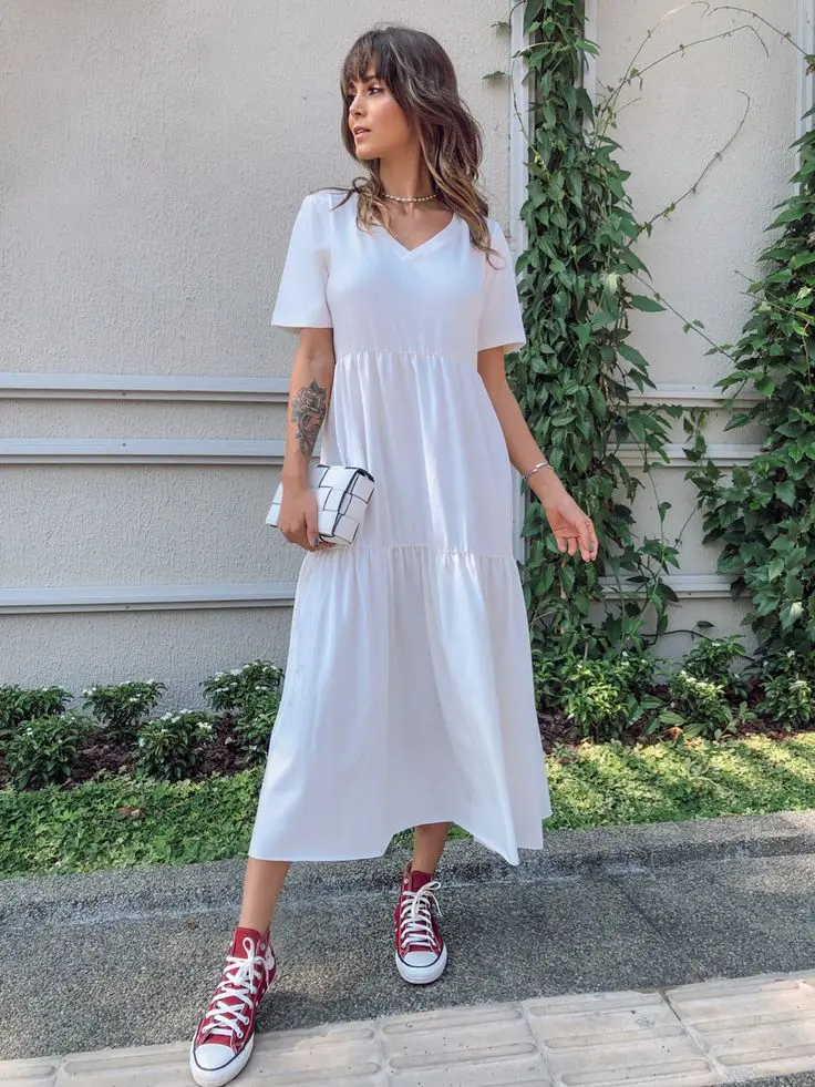 Vestidos fluidos ficam ainda mais modernos com o impacto dos tênis coloridos.