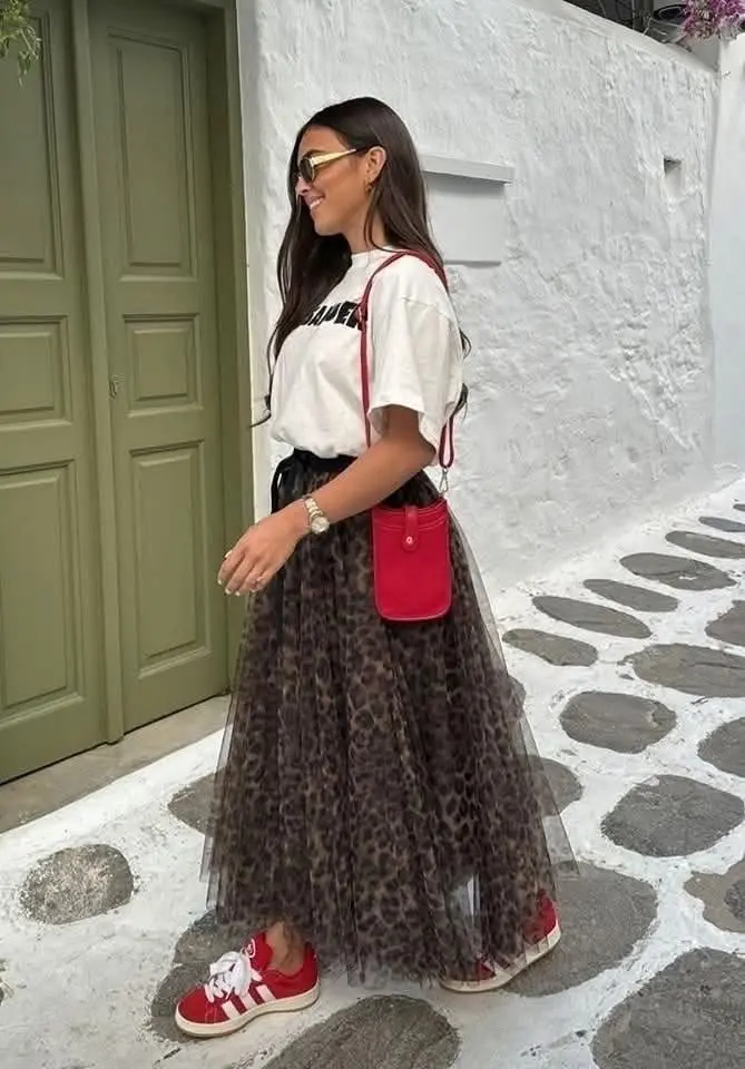 Combine saias midi ou plissadas com tênis vibrantes para um visual moderno e cheio de personalidade.