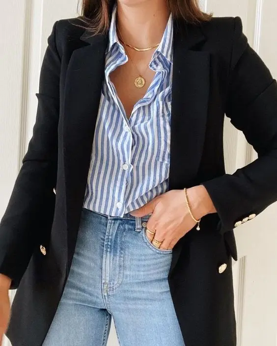 Camisa listrada com blazer: O blazer adiciona estrutura e formalidade. Opte por um blazer em uma cor sólida, como preto ou cinza, que contrasta com as listras da camisa.