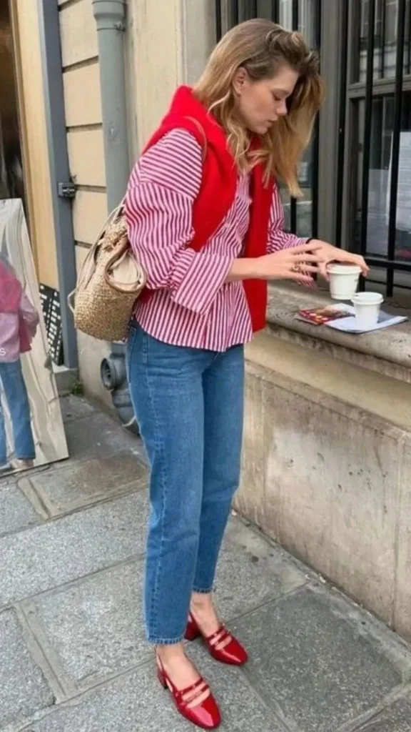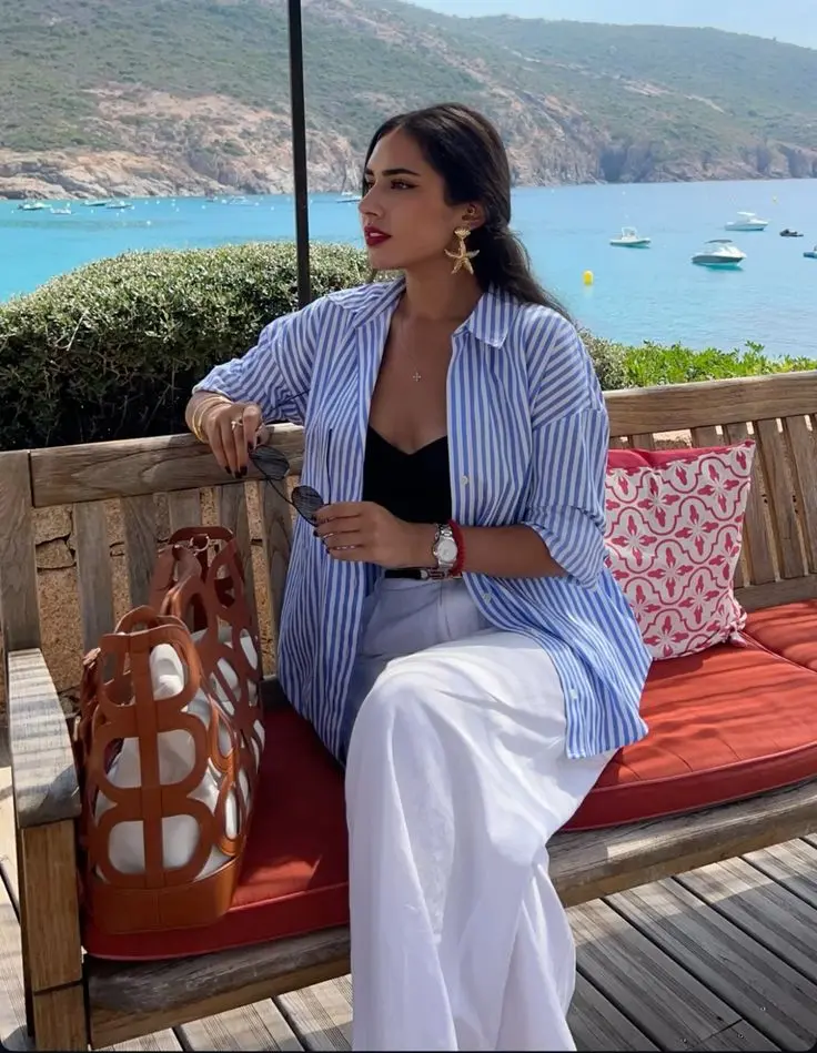 Para um look casual chic, experimente combinar sua camisa listrada com um jeans de cintura alta e tênis brancos. Este conjunto não só é confortável, mas também elegante. Você pode adicionar um a camisa como segunda peça para um toque descontraído. Se a ocasião permitir, um par de sandálias de salto bloco pode elevar ainda mais o visual.