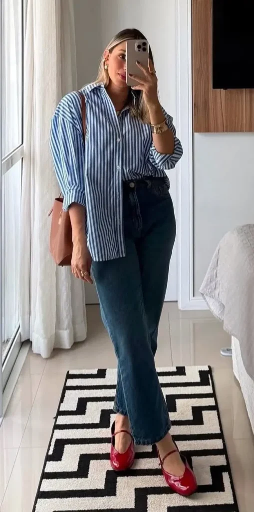 Camisa Listrada com Jeans: Para o dia a dia, uma camisa listrada com jeans skinny é uma combinação clássica e atemporal. Adicione tênis brancos para um toque descontraído.