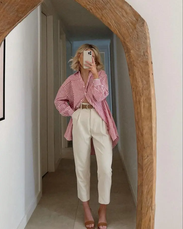 Camisa Listrada com Calça de Alfaiataria: Para um look de trabalho, opte por uma camisa listrada em tons neutros combinada com uma calça de alfaiataria. Complete com um blazer e sapatos sociais para um visual mais executivo.