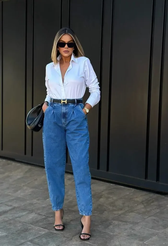 Look de Trabalho: Use a calça jeans com uma camisa e um blazer bem cortado. Complemente com sapatos oxford para um toque profissional.