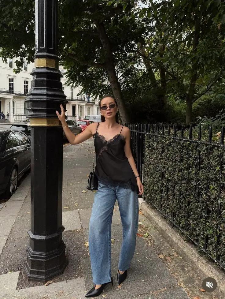 Look de Noite: Troque a camiseta por um top de seda ou renda. Um par de sandálias de salto alto e brincos statement completam o visual.