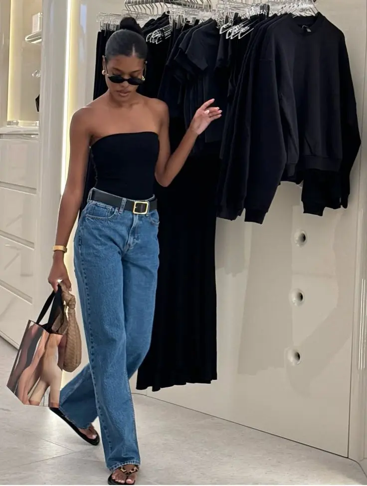Look de Verão: Combine a calça jeans com uma blusa cropped e sandálias, completando com um chapéu de palha ou bolsa de palha.