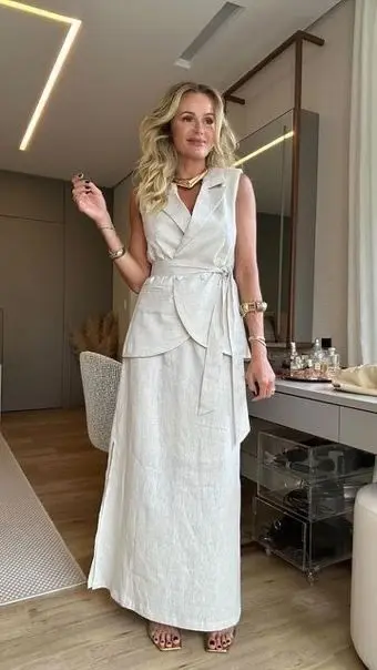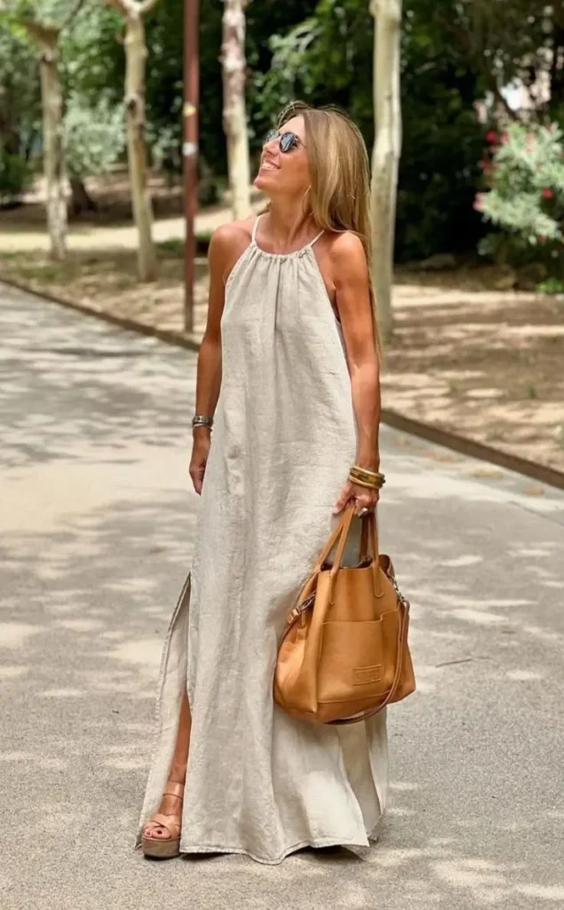 Vestidos Longos e Fluidos: Ideais para eventos ao ar livre, os vestidos de linho oferecem elegância e conforto. Combine com sandálias rasteiras ou plataformas para um look descontraído.