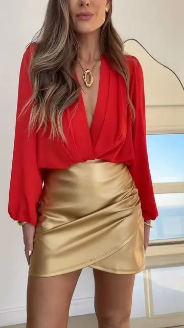 Dourado: O vermelho com dourado cria uma combinação luxuosa e marcante. O vermelho transmite paixão e força, enquanto o dourado acrescenta brilho e sofisticação. Juntos, formam um look elegante, ideal para ocasiões especiais.