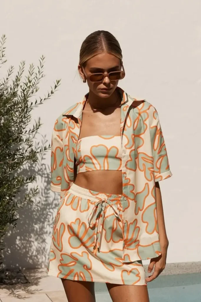 Férias: Estampas tropicais são uma ótima escolha para momentos de lazer. Combine uma saia midi estampada com uma camiseta básica e sandálias para um look leve e divertido.